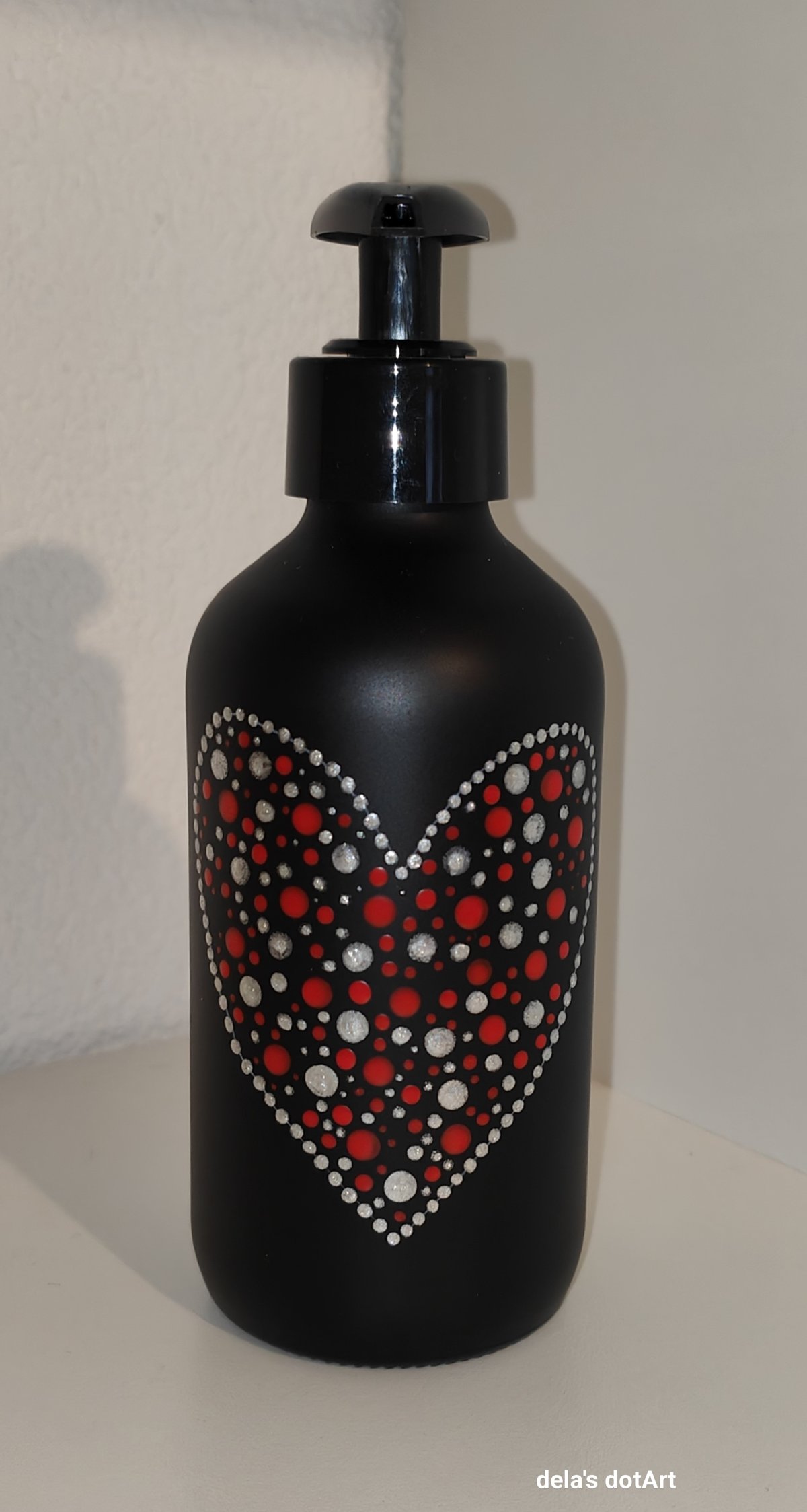 Der Seifenspender ist mit hochwertiger Acrylfarbe im einzigartigen Dot-Painting-Stil handbemalt, wodurch jedes Stück ein echtes Unikat wird.
