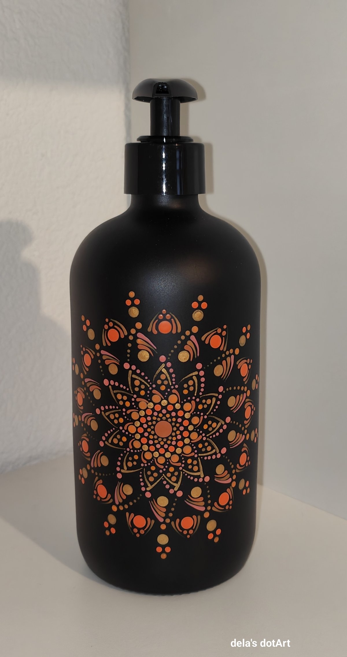 Der Seifenspender ist mit hochwertiger Acrylfarbe im einzigartigen Dot-Painting-Stil handbemalt, wodurch jedes Stück ein echtes Unikat wird.