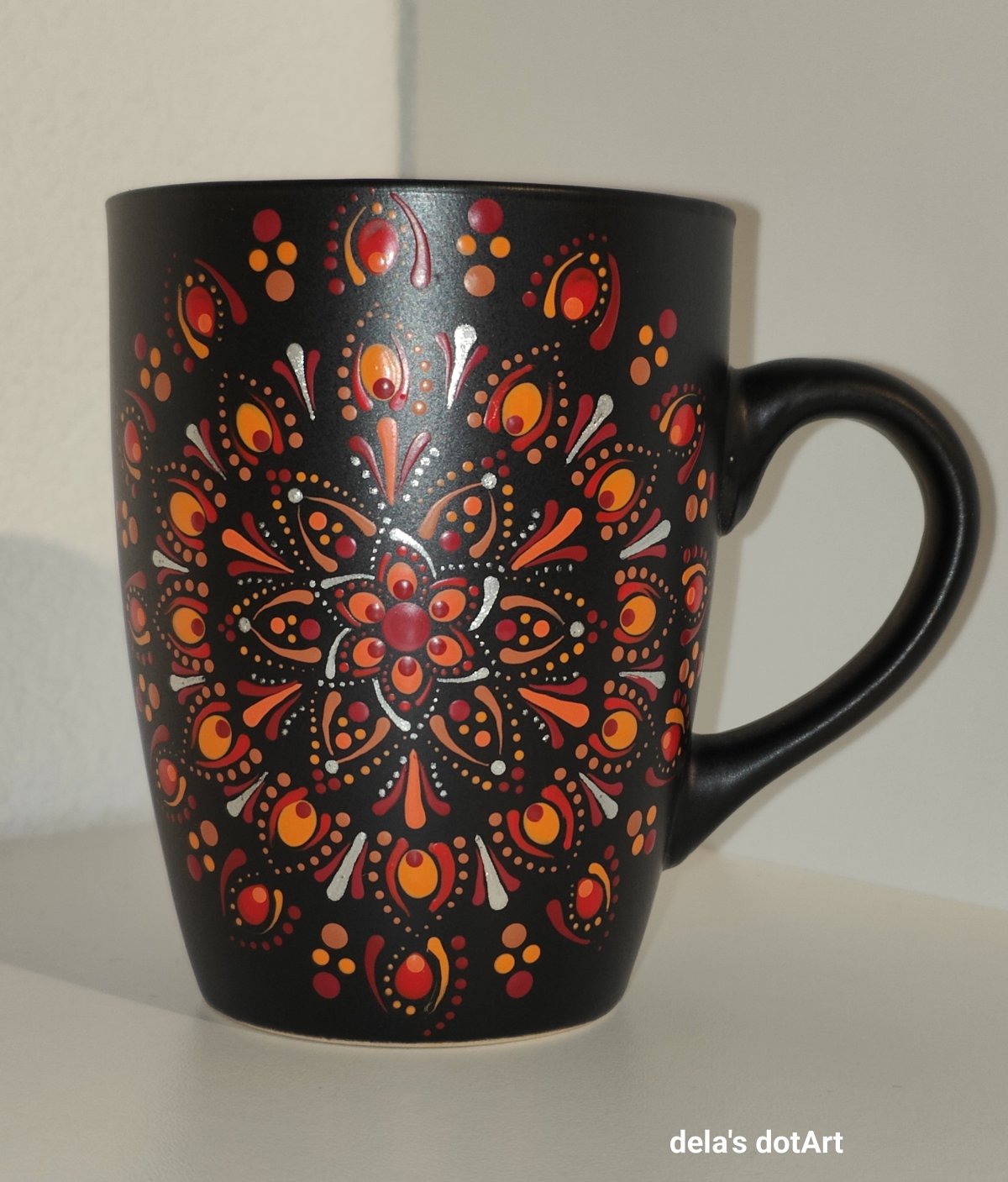 Diese stilvolle Porzellantasse ist mit einem einzigartigen Dot Painting Design aus hochwertiger Acrylfarbe verziert.